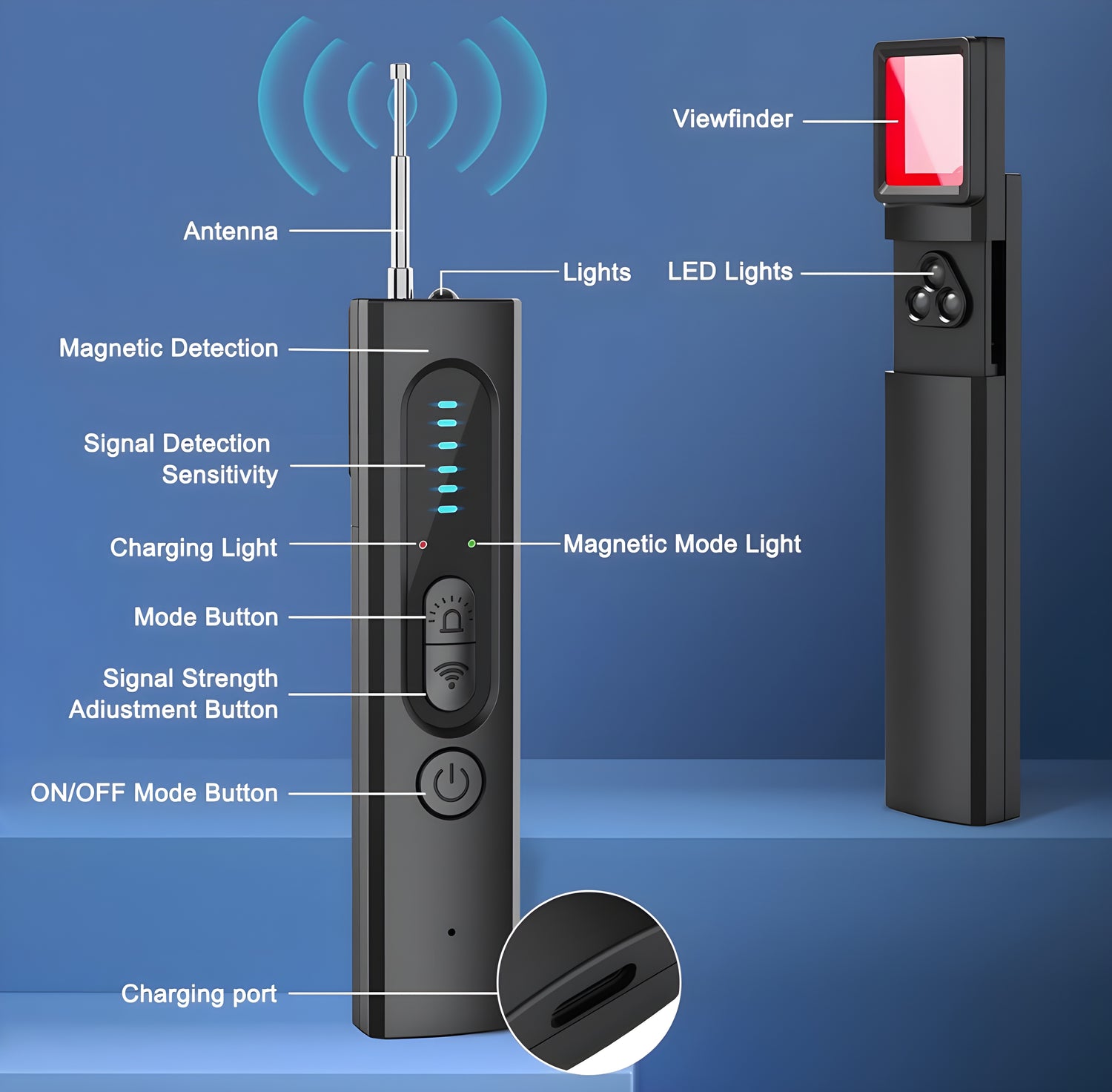 "Stay protected anywhere with this powerful bug detector. It features signal and magnetic detection, a hidden camera lens finder with LED lights, and easy controls for adjusting sensitivity. Compact, rechargeable, and perfect for home, travel, or work".