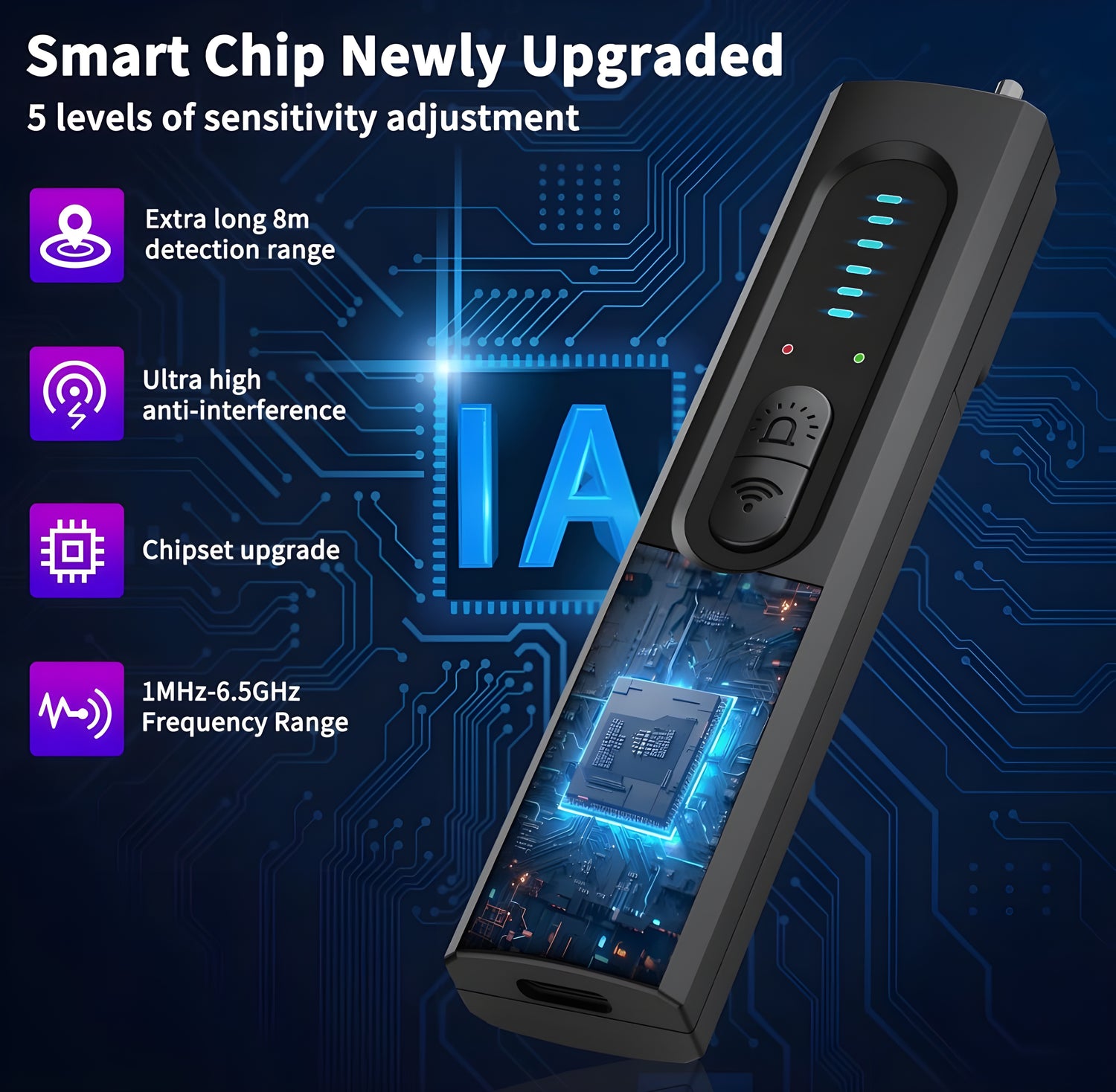 "Experience next-level detection with our newly upgraded smart chip. With ultra high anti-interference, a powerful 8-meter range, and 5 levels of sensitivity adjustment, it detects signals from 1MHz to 6.5GHz quickly and accurately".